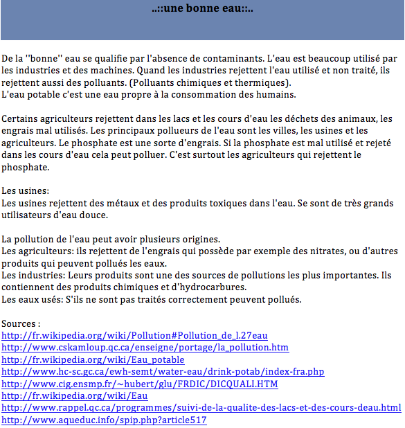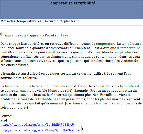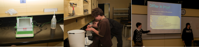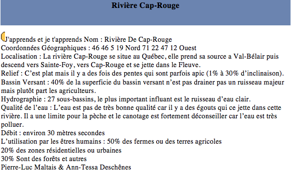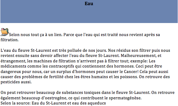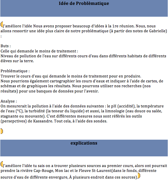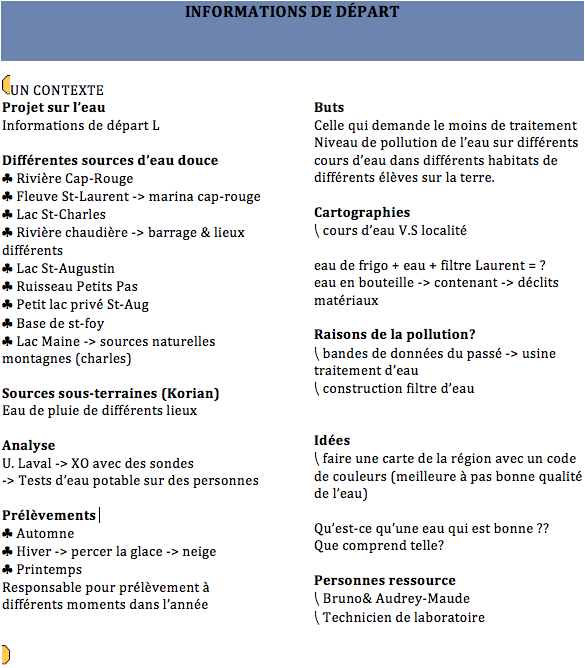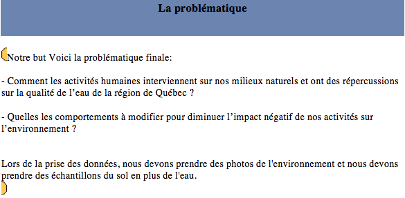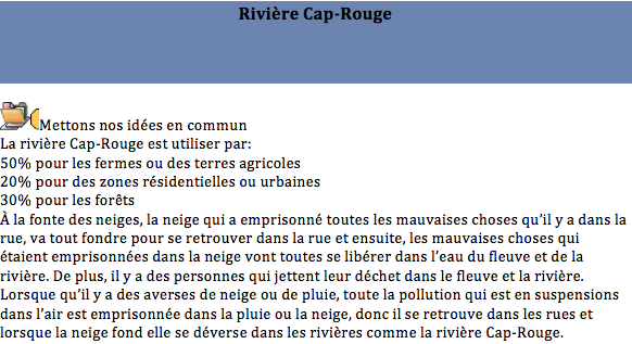 Inspired Tomorrow's Innovators' activities that took place during the 2008 Summer Institute in Toronto, secondary students from the PROTIC program at Compagnons-de-Cartier School decided to investigate on water quality in their area. In addition to the use of the Knowledge Forum to support their knowledge building process, students have demonstrated creativity in their approach. Indeed, they first tried to define their research project to later collectively develop the problem. A step that remind us an authentic research process.