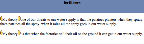 Prenons l'exemple d'une classe de la commission scolaire Eastern Township. À l'aide du Knowledge Forum, outil qui leur a servi à soutenir leur démarche de coélaboaration de connaissances, les élèves ont enquêté sur les menaces actuelles et potentielles d'un étang de leur localité. À partir de la question de départ suivante : « Quelles sont les menaces qui pèsent sur la vie aquatique de notre étang? », les élèves ont identifié plusieurs menaces : la contamination chimique d'origine domestique ou agricole, les pluies acides, la prolifération de certaines bactéries et algues et la sédimentation des cours d'eau dus à l'activité humaine. Dans leurs échanges, les élèves ont abordé la problématique de la pollution aquatique selon différentes perspectives.