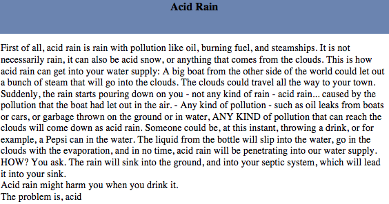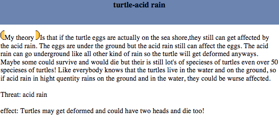 Ils ont fait des recherches sur les pluies acides et ses causes. Ils se sont questionnés sur leurs conséquences possibles sur l'étang, sa faune et sa flore.
